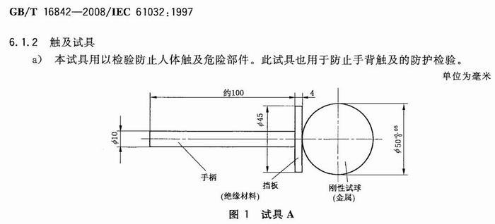 A型試驗(yàn)探棒是根據(jù)GB/T 16842:2008、GB/T 4208:2008、IEC61032:1997、IEC60529:2001等標(biāo)準(zhǔn)制作而成,用以檢驗(yàn)防止人體觸及危險(xiǎn)部件,也用于防止手背觸及的防護(hù)檢驗(yàn)。
